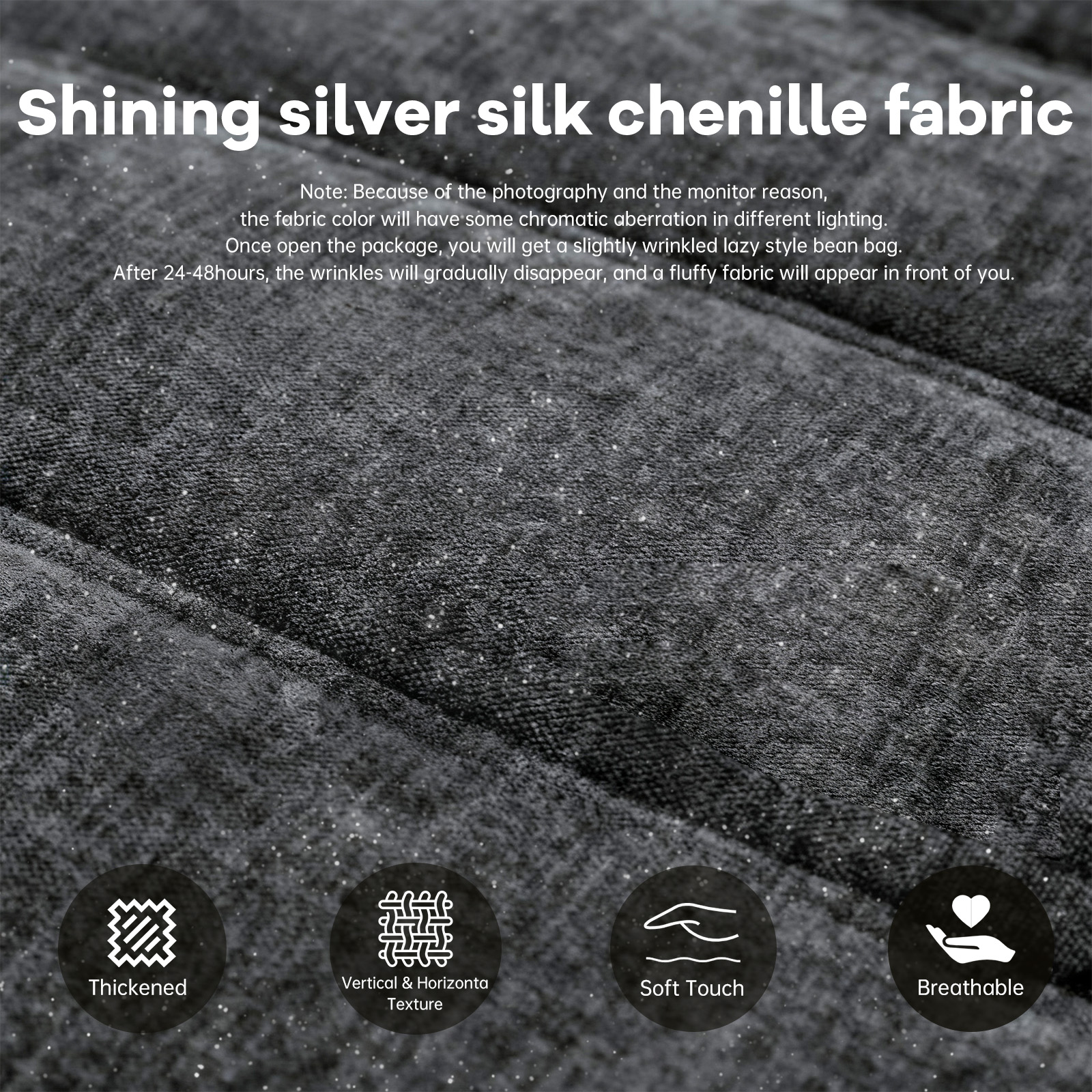 • Premium Shining Silver Silk Chenille FabricFeatures thickened vertical & horizontal texture with high-rebound sponge filling. Note: Wrinkles upon unboxing disappear naturally within 24-48 hours, revealing a luxuriously fluffy surface.